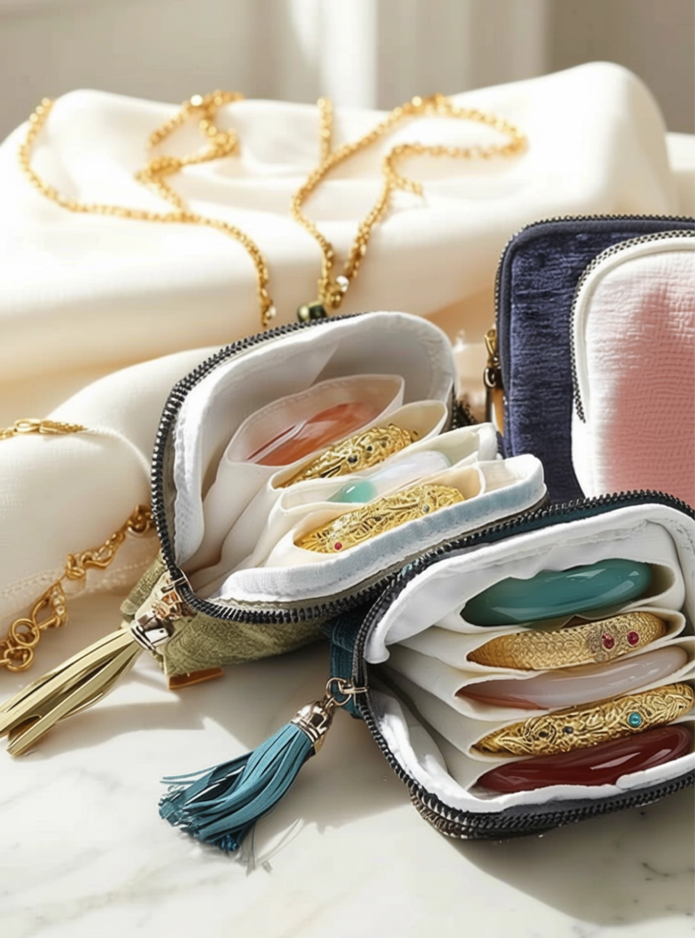 The Travel Jewel Case is designed with soft multi-slot pockets that gently hold your bracelets, earrings, and small treasures in place. Perfect for travel or everyday use.