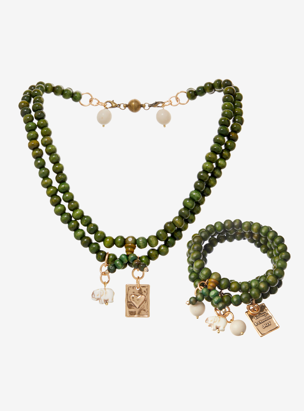 The Today I Choose Joy wrap piece was designed to inspire peace and positivity wherever life takes you. Hand-strung with green wooden beads and accented with a gold-finish heart pendant, it pairs effortlessly with your daily look while keeping your spirit grounded in gratitude.