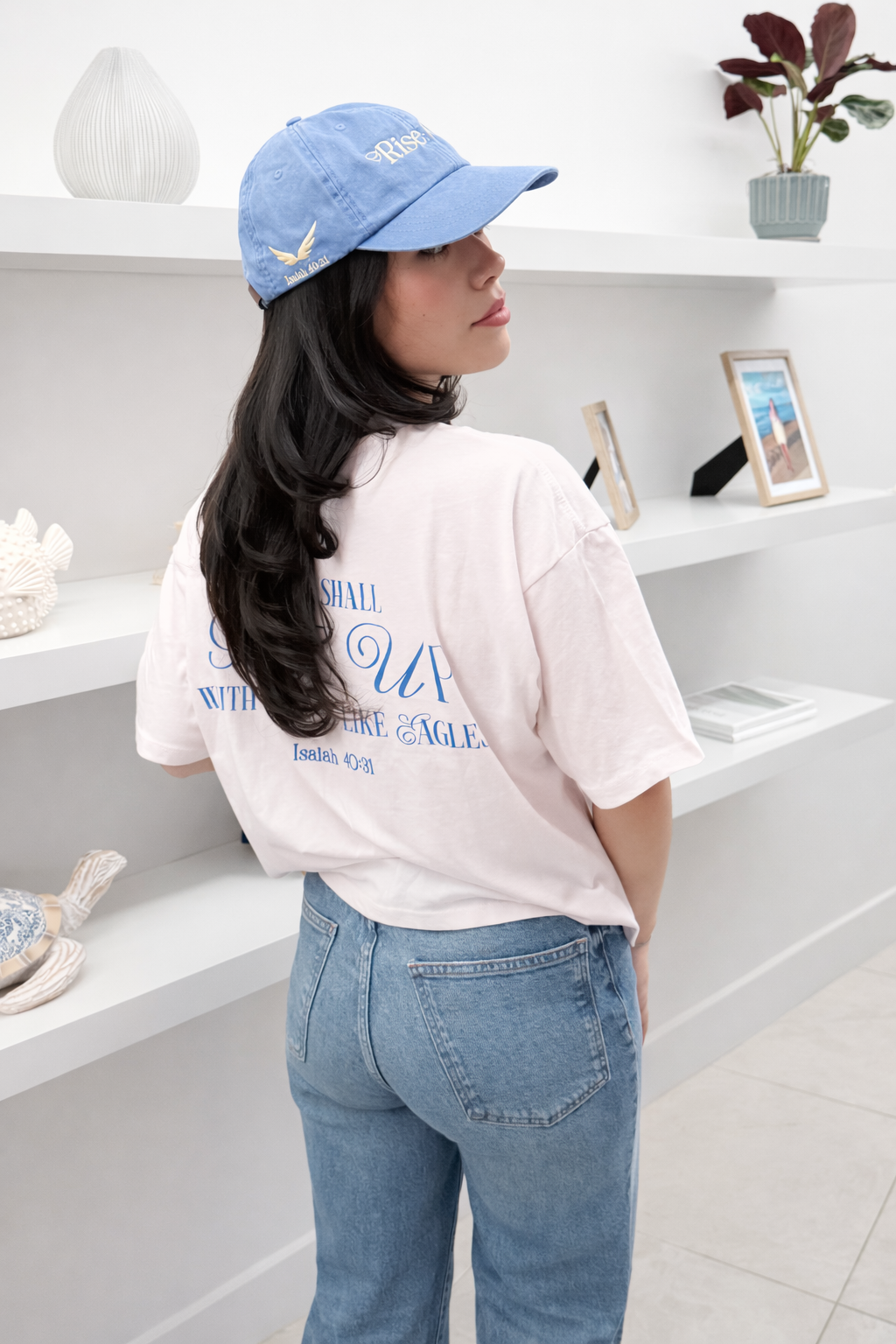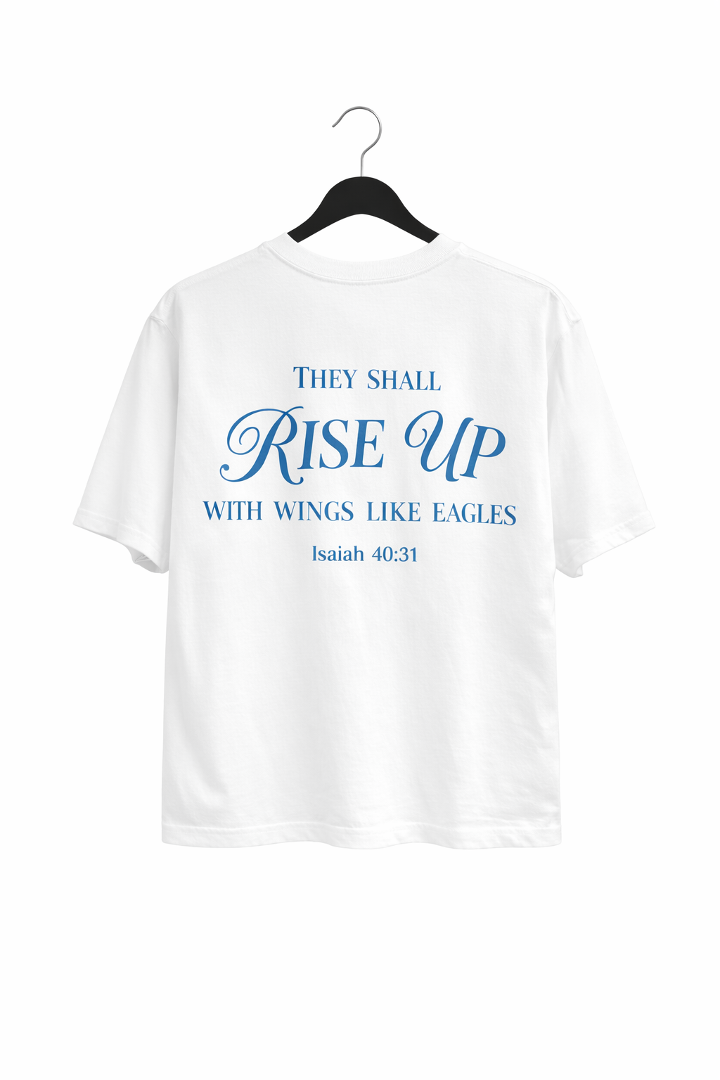The front is detailed with our signature wing graphic, a subtle symbol of strength and faith. The back carries the powerful promise of Isaiah 40:31, reminding us to rise with renewed strength.