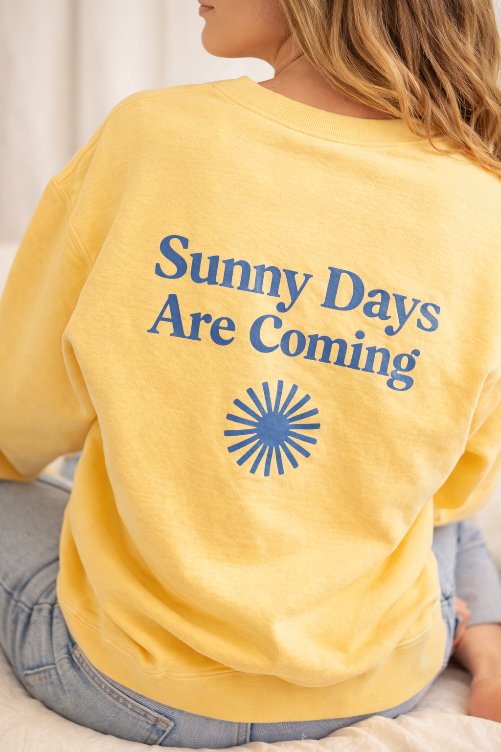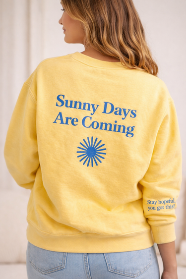 Made in a soft sunshine-yellow tone, this crewneck features the message “Sunny Days Are Coming” across the back with a simple sun graphic, symbolizing hope and renewal. A subtle sleeve detail reads “Stay hopeful, you got this!”—a gentle reminder you can carry with you throughout the day.