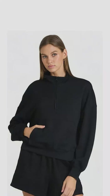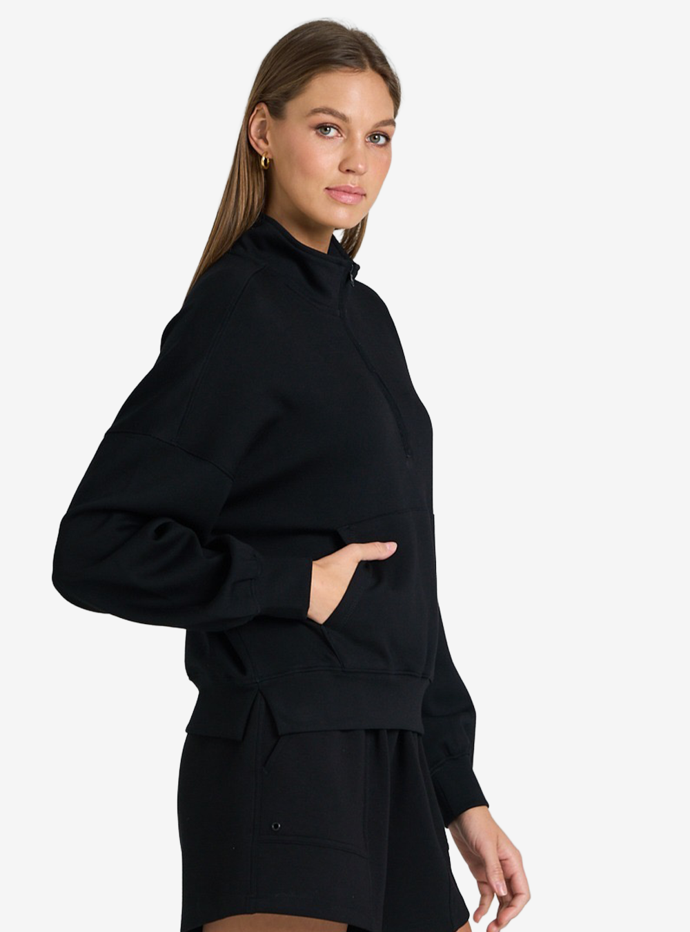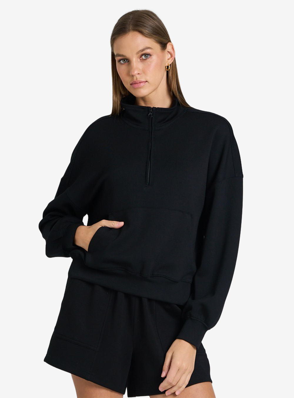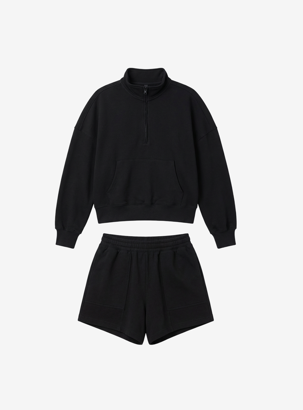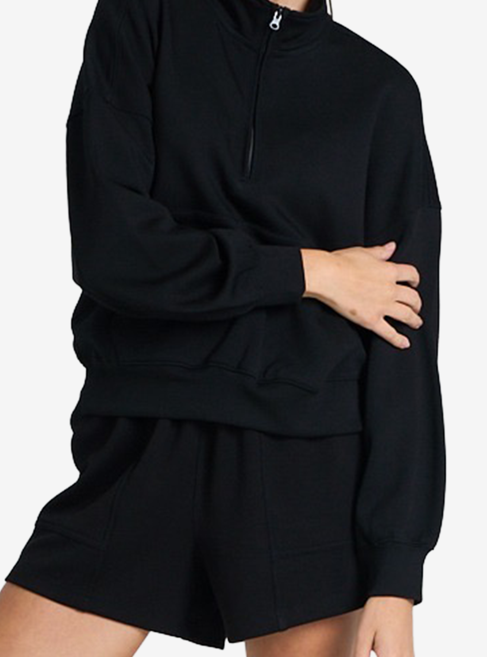 For the days when you’re up and out the door, The Go Set has you covered. This comfy black pullover with a mid-zip detail pairs perfectly with matching shorts for a relaxed, effortless look. Whether you’re walking the dog, dropping the kids off at school, grabbing coffee, or running errands, this set makes getting ready simple and stylish. Cozy enough to lounge in, but cool enough to step out — The Go Set is your new everyday essential.